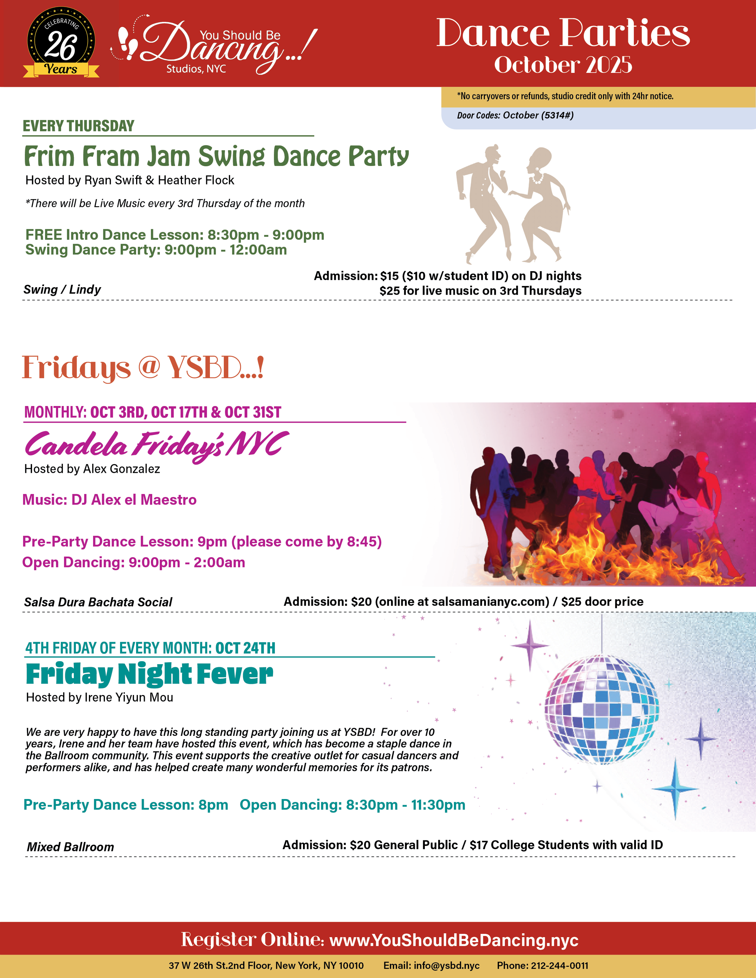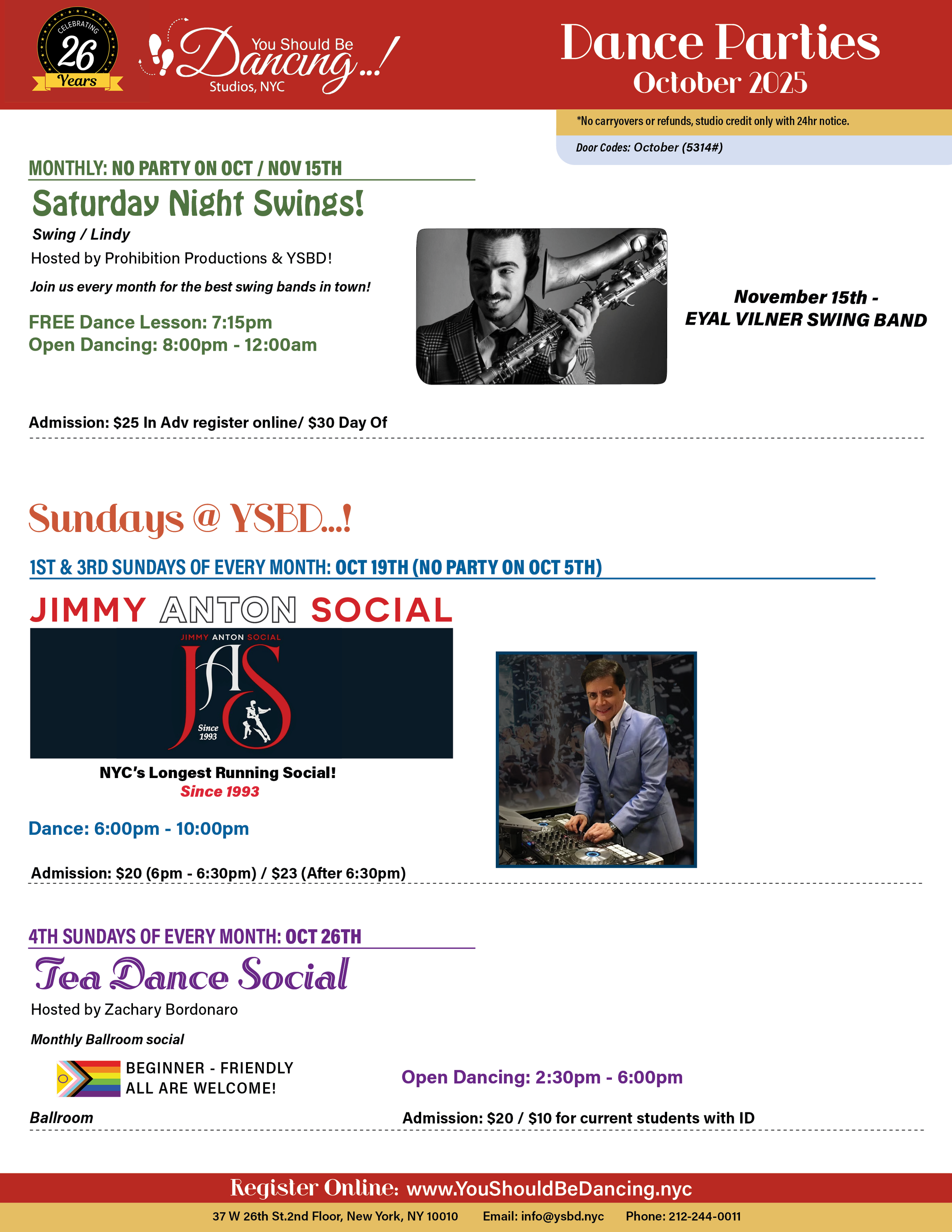 Join us every month for the best swing bands in town at the gorgeous new YSBD studios… with an amazing floor, plenty of space, cash bar and tons of AC!